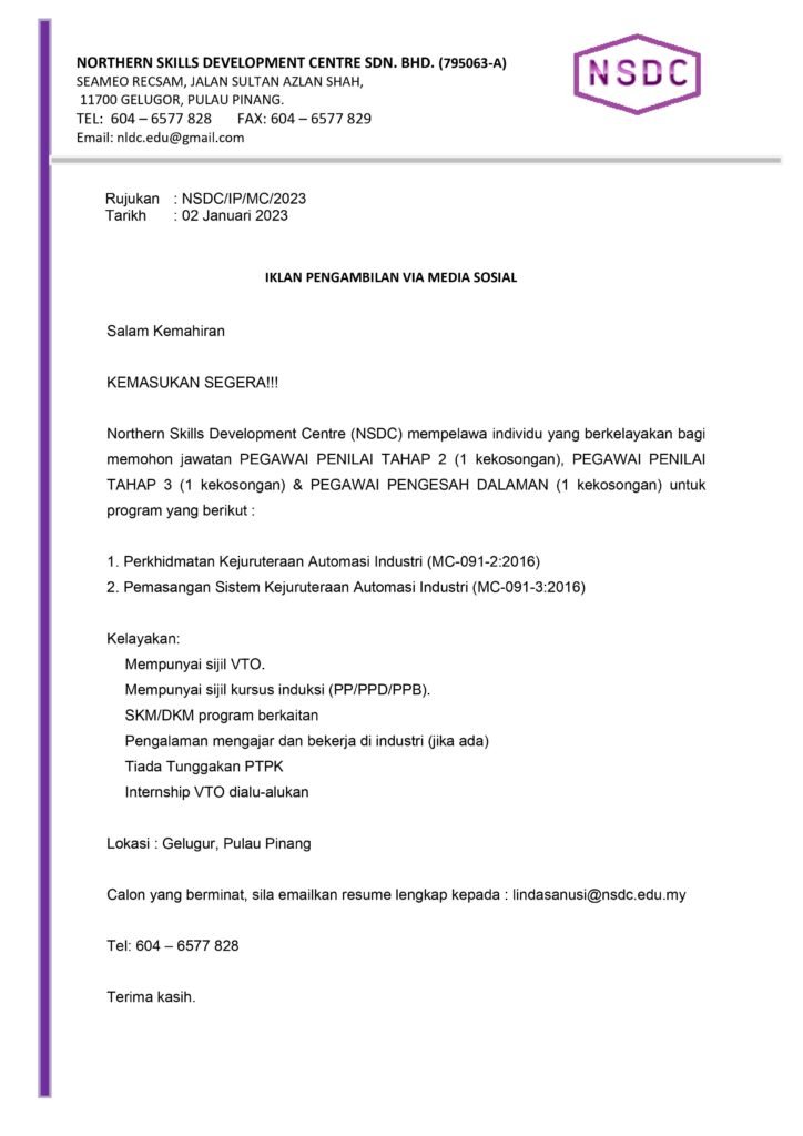 Kickstart your career with NSDC. If you’re passionate about skill development and education, this form is your gateway to joining our team. Apply now and be a part of our mission to reshape skill training in Malaysia.